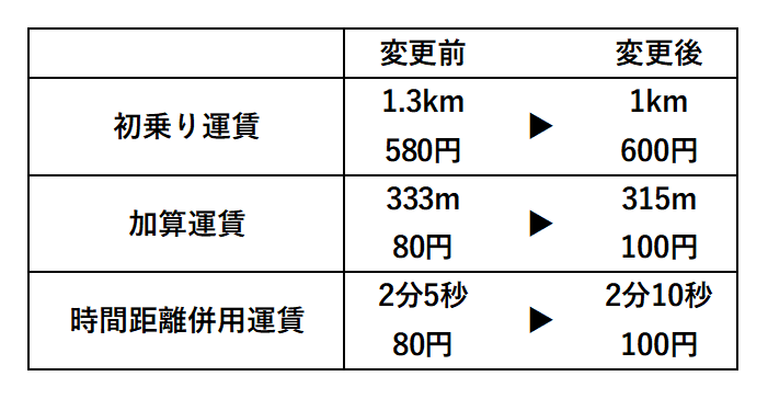 運賃改定のお知らせ いつも祝谷タクシーをご利用いただき誠にありがとうございます。 昨今の物価上昇に伴い、2025年12月19日より利用料金を下記の通り改定させていただきます。 ※なお、迎車料金は100円加算されます。 何卒ご理解を賜りますようお願い申し上げます。